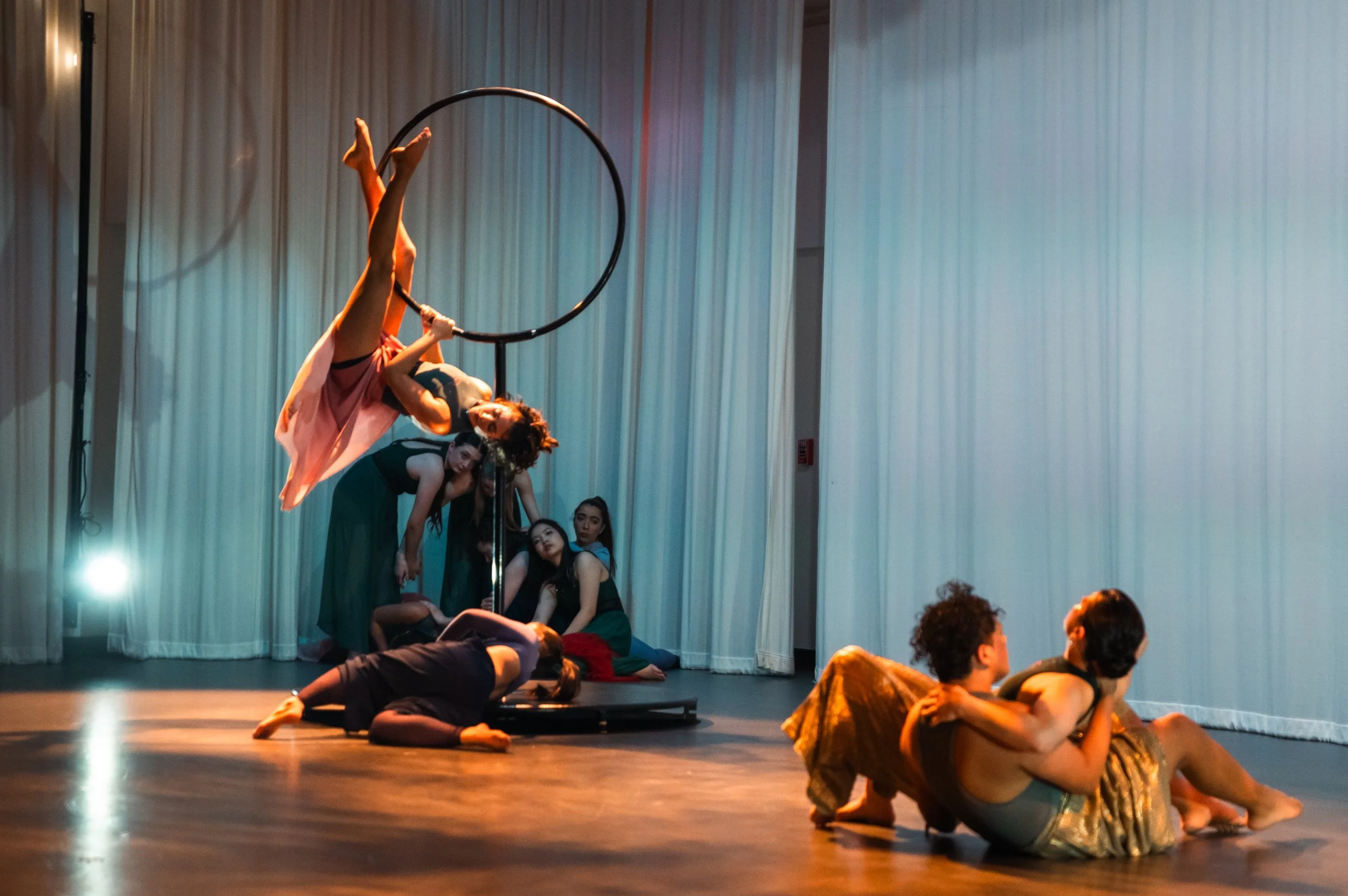 An evening-length dance performance animating underwater worlds and the sensorial life of water, marine animals, and plants. Performed by Denison Dance Company, the work draws inspiration in the natural world to encourage respect, cooperation, relationality and guardianship of the currents, rhythms, family life, in the deep ocean. Created in collaboration by Denison University dance faculty: Marion Ramirez, Mollie Wolf & Ojeya Cruz Banks along with guest aerial artist, Danya Contractor and creative input from the dancers. Fish Sing/Pez Canta features the music compositions of Matthew Peyton Dixon and dakota camacho, along with mesmerizing Chinese pipa played by student-dancer-musician Shujun Liu.